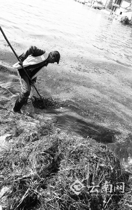 “这段时间,一天只打捞起一吨多水草。”在向阳湾用网兜打捞死亡水草,也是赵会刚每天要做的工作。用网兜扒不动的,就用手一堆堆地抱起来。“12月~2月水葫芦最多,一冲下来就有10多亩,我们划着船进去,把锚丢进水里,外面的人用绞盘拉,用耙子挖,一天能拉出200多吨水葫芦。”