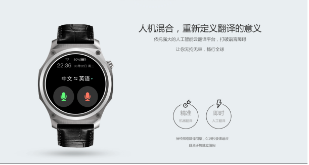 腕译是中业科技(股票代码:834134)独立自主研发的人工智能翻译手表,基于中业人工智能云翻译平台,为用户提供8种语言(中、英、日、韩、德、法、俄、西)的双向陪同翻译服务,包括准确的机器翻译和即时人工翻译。腕译内置4000万条日常生活语料资源,基于深度神经网络算法的突破创新,能准确识别你说话的场景,并按照地道的外语表达方式翻译出来。同时,在腕译的录音和翻译过程中不会受到外界嘈杂环境的干扰,能清晰识别你说的每一句话并在0.19秒内反馈翻译结果,让沟通无缝衔接。