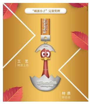 此次感恩节线上马跑奖牌名曰“破蛋小子”,以红、银两色作为奖牌主色调,带着蛋壳的卡通火鸡为轮廓设计而成。奖牌上“THANKSGIVING DAY”的英文标识直观的展示出此站是感恩节线上跑,让人眼前一亮。