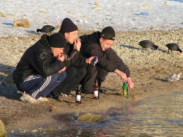 一根烟,一瓶1.5L的啤酒,腰上挂着钥匙串,俄罗斯人的“斯拉夫蹲”一点也不比“亚洲蹲”逊色。