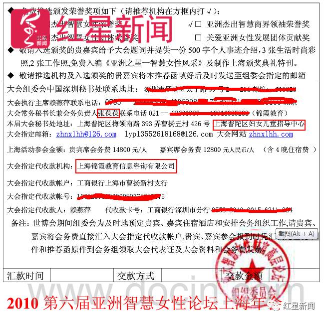 红星新闻注意到,在“2010第六届亚洲智慧女性论坛上海年会”的宣传资料中,报名参会者均需交费,“贵宾席会务费14800元/人,嘉宾席会务费12800元/人。”