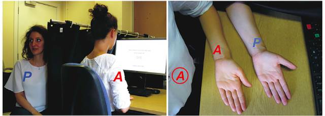 触碰者(A)在与被触碰者(P)互不可见的情况下,触碰自己和对方的手掌及前臂,并判断谁的皮肤更柔软。图片来源:研究论文