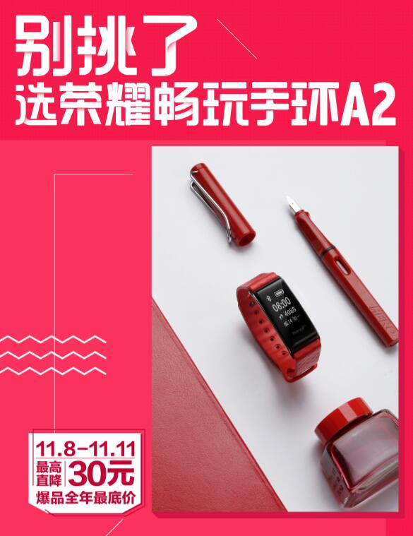 荣耀手环A2配备0.96英寸超大屏幕,支持生活防水,拥有专业运动监测和连续心率监测功能,数据上传云端还能自动生成分析报告,为用户提供专业的运动指导和健康呵护。据了解,荣耀手环A2正在参加“别挑了,选我”的双11特惠活动,现在购买能够享受到直降30元的折扣优惠,只要169元就可以把明星同款手环带回家!