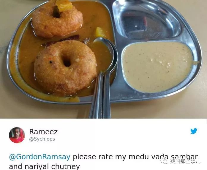 狗蛋哥,请给我的vada sambar(由豆类,西米或土豆制成类似甜甜圈的东西,蘸酱是一种扁豆和蔬菜炖的杂烩汤)和nariyal chutney(椰子酸辣酱)打个分吧!