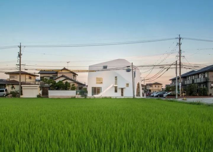 及至竣工,命名“四叶草之家”的幼儿园,从外部看上去,就像搭建在青青稻田中的一顶巨大的白帐蓬。