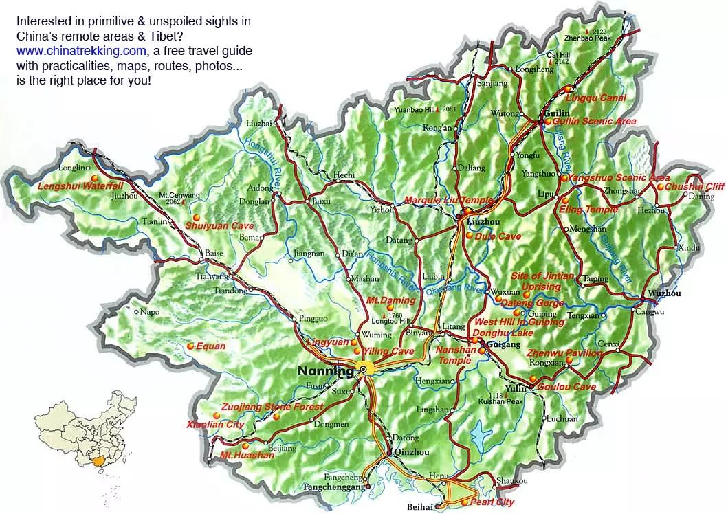 广西,位于中国地理上的第二台阶,云贵高原东南边缘,南临北部湾,面向东南亚,西南与越南毗邻,东邻粤、港、澳,北连华中。大致范围在东经104°26'—112°04',北纬20°54'—26°24'之间,地形自西北向东南倾斜,境内山峦起伏、岭谷相间,山地占多,广布喀斯特,只有中间靠西的部分有一片平原,形成一个小盆地,北回归线横贯中部。
