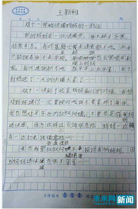 双十一9岁女儿王新雅写给快递妈妈的一封信(受访者供图)