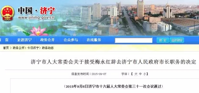 当天,山东济宁市人大常委会接受了梅永红辞去济宁市人民政府市长职务的请求。