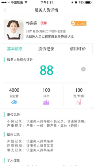 除此外,“家政查”也是一款专业和优质的家政服务人员信息挖掘工具,雇主可在线上参考服务人员综合评分及服务评价来挑选自己中意的家政服务人员,并一键下单雇佣该服务人员。除上述查询信息外,还可查询家政服务人员基础信息、健康情况、资质凭证、诚信积分、履历报告、不良记录、信用评论等信息