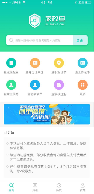 家政查,该系统从源头推出了针对家政服务人员背景调查业务,所谓的员工入职背景调查,就是即将入职及已入职多年的员工进行系统的背景调查,主要包括身份验证、负面社会安全记录、法院诉讼记录、法院失信记录、金融风险记录等。此举可让雇主更好地了解和甄选保姆。