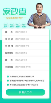 同时,为实现服务人员与雇主达成互通效应,后续服务人员也将可以对雇主进行评价,做到公开公正。其次,服务人员也可以在“家政查”线上找工作,填写相关信息并提交即可或者雇主查看阅览,以往的诚信表现积分与全网评价可作为服务人员资本,同时系统将会以筛选机制进行优质推荐,所以,良好的表现将对服务人员职业生涯有直接性的影响!