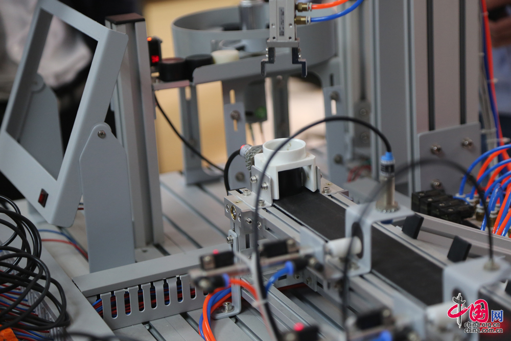 学员用来练习的光机电一体化实验装置,这是一个模拟机械手臂编程自动识别分拣系统,如果一个学员可以独立完成模拟机械手臂的编程,基本就达到了技师水平。