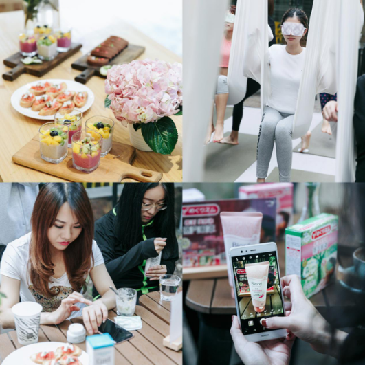 空中瑜伽和美妆护肤,是时下女生关心的二大话题,看似没有关联的两者,在<愉+美丽 新主张>的活动上完美结合。邀请嘉宾全程参与“空中瑜伽”体验课程,感受反重力瑜伽这一时下流行运动的魅力;同时,通过尝试佩戴蒸汽眼罩使体验者更快进入放松状态,也在活动中让嘉宾身体力行地了解到女生在运动前卸妆,运动后合理使用护肤品的重要性。