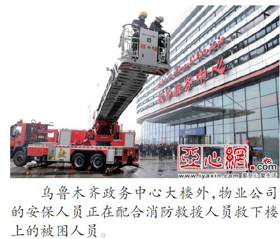 亚心网讯 (文/图首席记者张万德)昨日,在乌市龙盛街益民大厦的乌鲁木齐政务中心举行了一次消防综合汇报演练。
