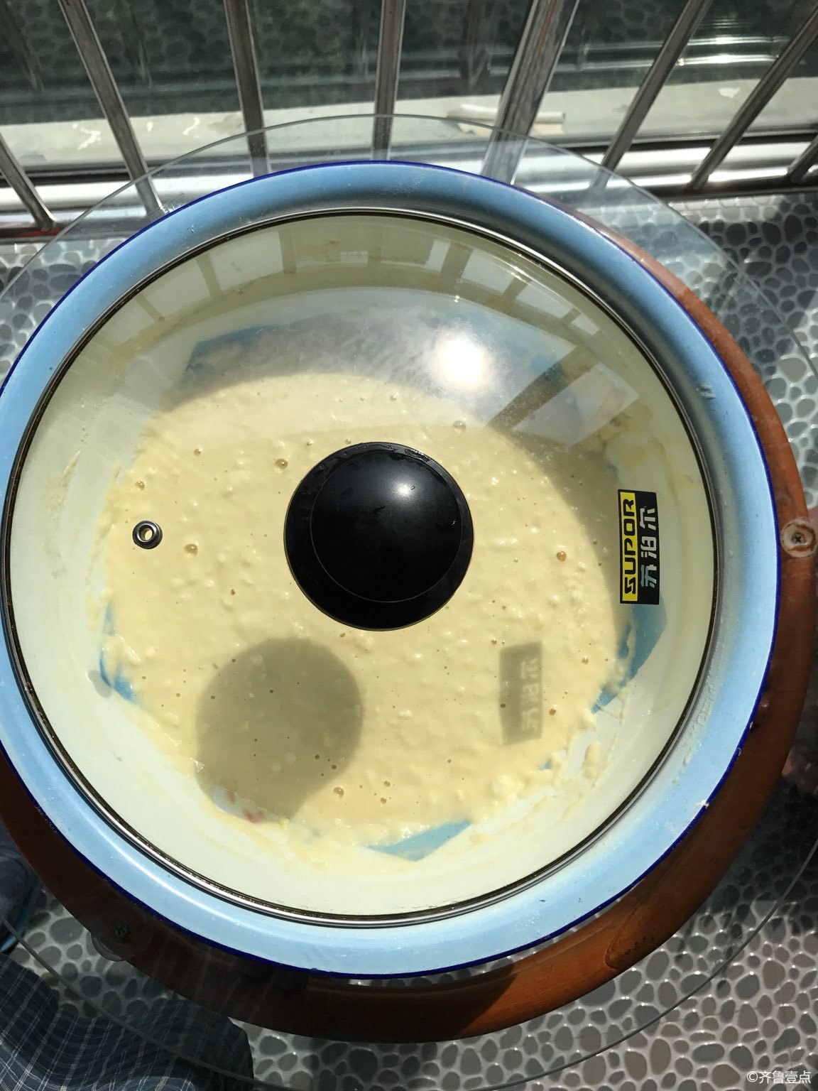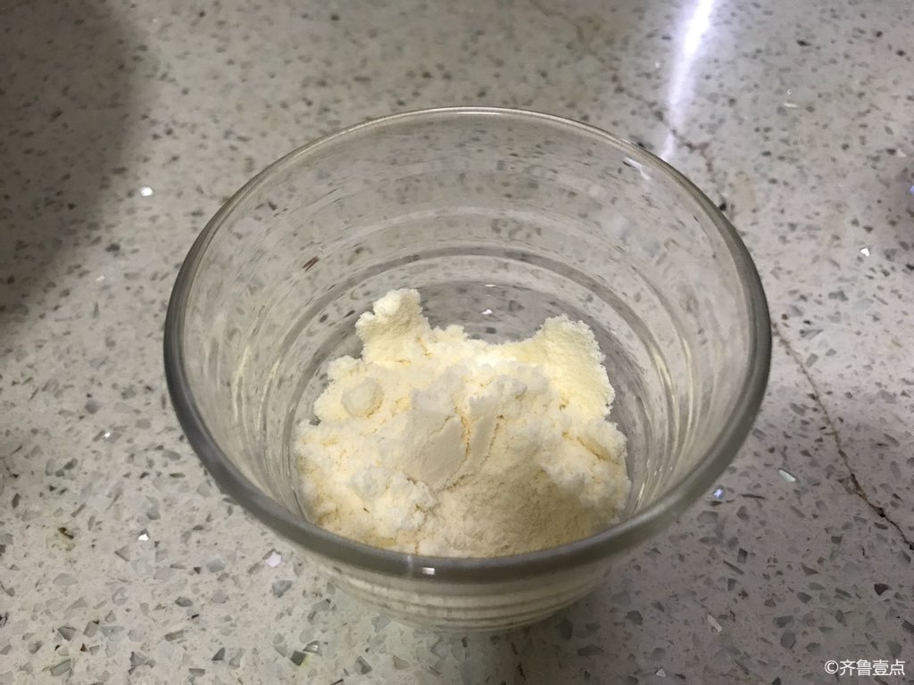 1. 酵母加点温水调匀+5个鸡蛋+1大勺奶粉+少许精粉,用筷子搅拌成糊糊放在温暖处等待发酵。