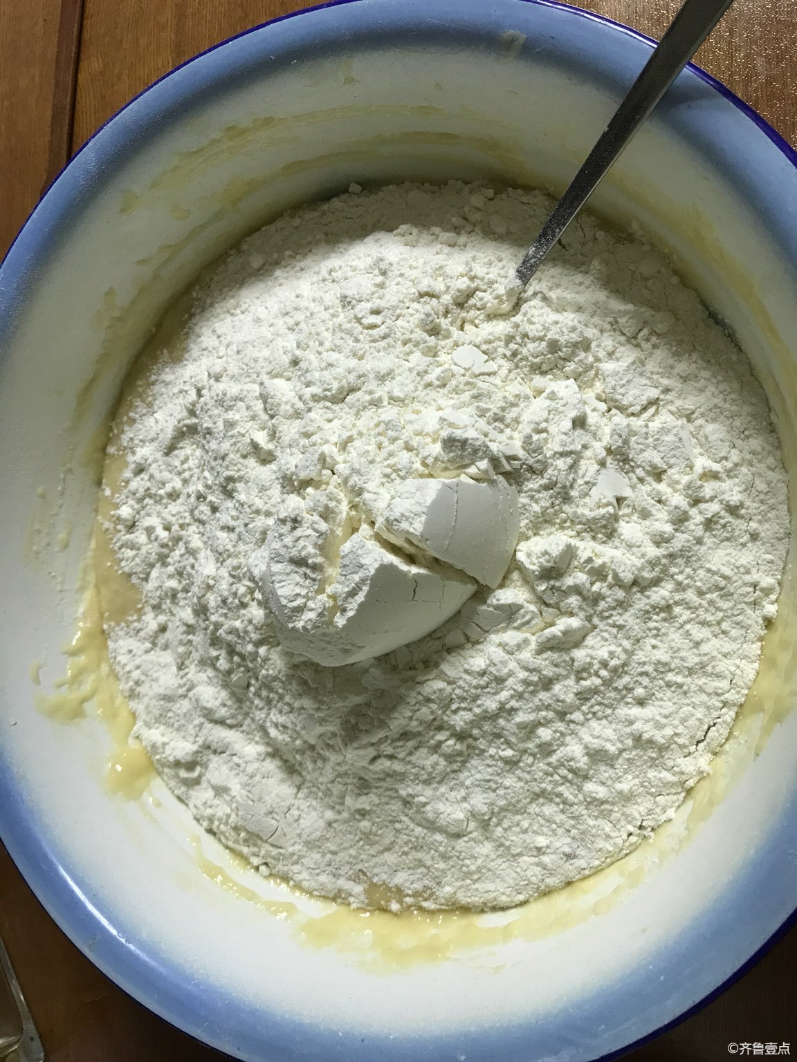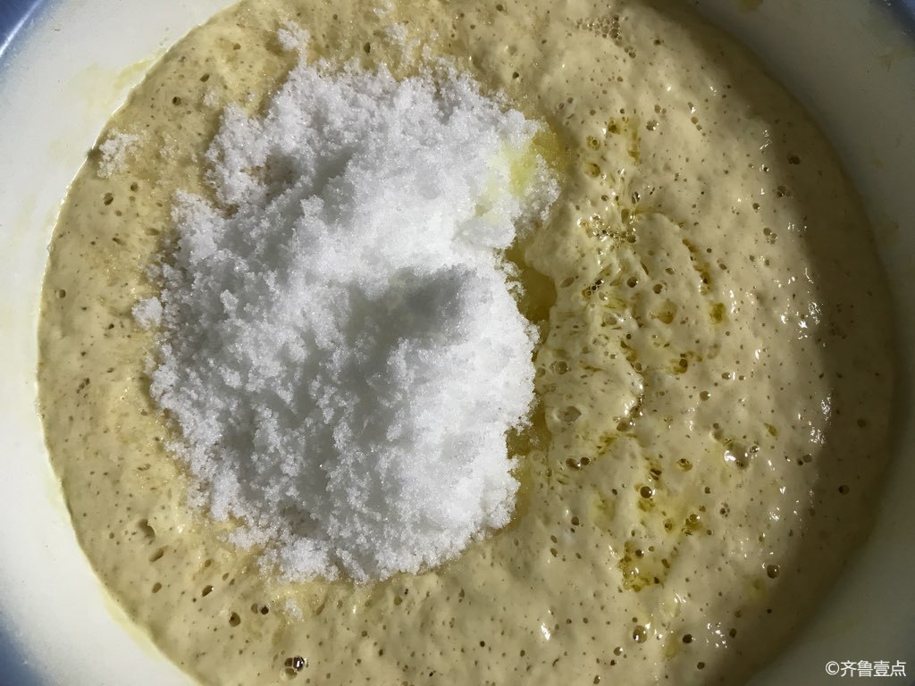 2. 见面糊有发酵气泡了,这时候就再加上大约多半斤白砂糖(根据自己口味加糖的多少)+大约2两食用油(加奶油更好)+面粉再次发酵。