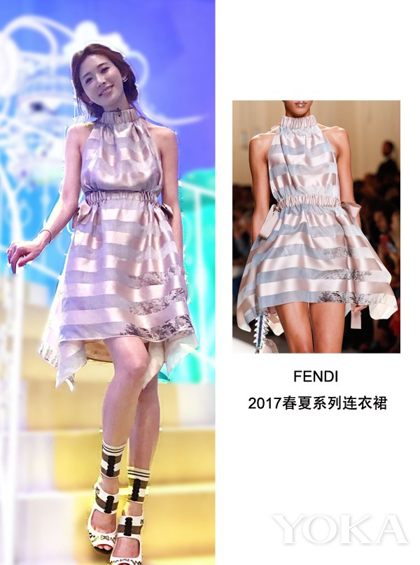 穿上FENDI这身无袖连衣裙,大玩锁骨杀,不规则的裙摆俏皮可爱,头发盘起,释放出随性的美。