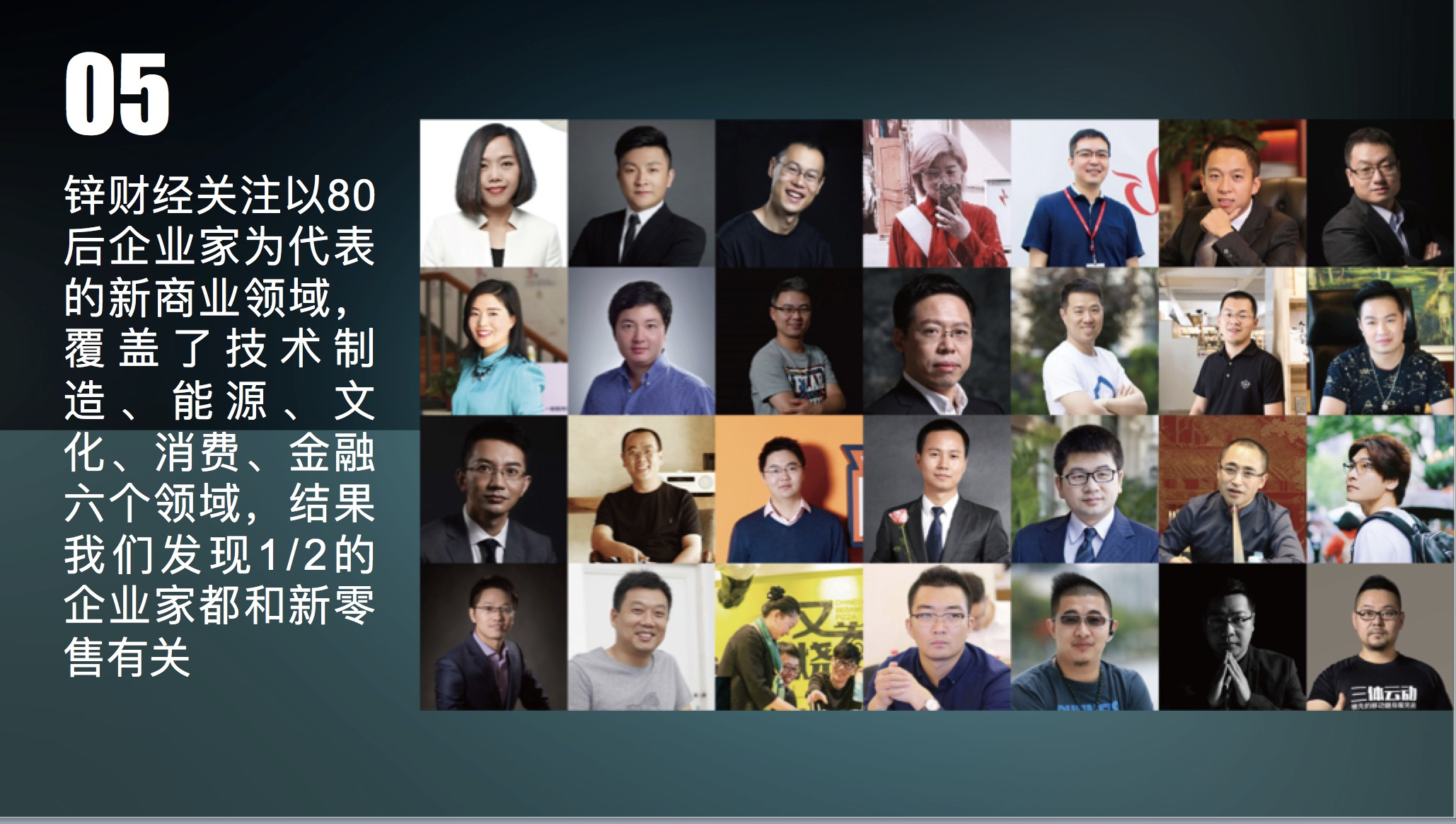 接受主办方邀请来演讲时,我特地翻了一下锌财经最近3个月的报道对象。我们锌财经一直关注以80后企业家为代表的新商业领域,覆盖了技术、制造、能源、文化、消费、金融六个领域,结果我发现1/2的企业家都和新零售有关。不是做上游,就是做前端,不是准备加入,就是已经偷偷试水。