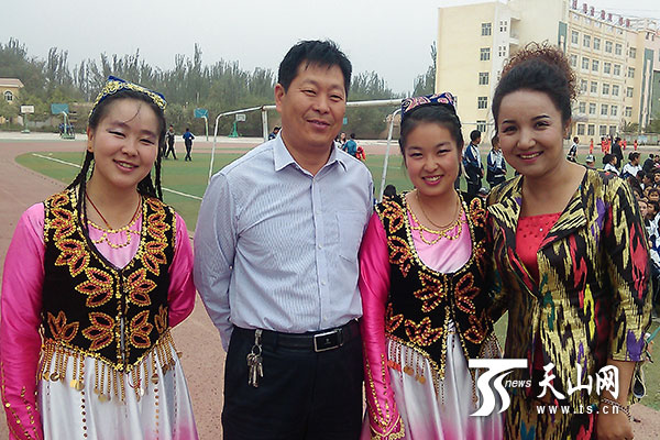 在学校开展的文艺活动中,古丽胡玛(右一)与同事合影。