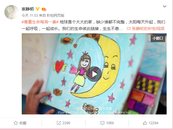 著名演员张静初特别为公益专题片《生生不息》配音,并在自己的官方微博进行发布,她希望通过这部公益片和自己的呼吁,能够让更多的人加入保护地球、尊重生命、每周一素的行动中来!我们的点滴善行,能够汇聚大爱,让我们的地球变得更加美好。