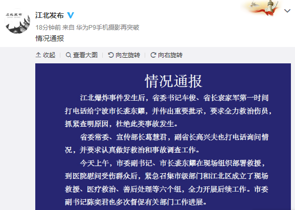 市长赴宁波江北爆炸案现场救援 2人重伤16人轻伤接受治疗