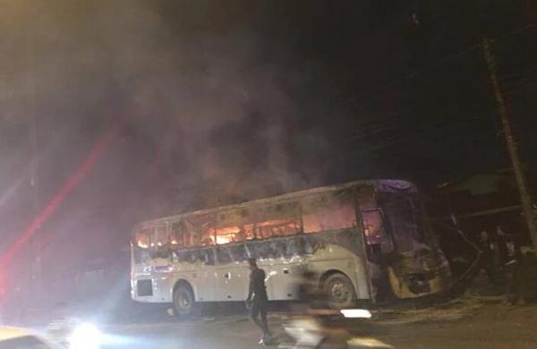 从泰国媒体发布的现场照片可以看出,整辆巴士车厢火光熊熊,窗口附近位置因燃烧脱落,大巴车身被几近烧毁。据警方透露,火灾具体原因目前还在调查中。