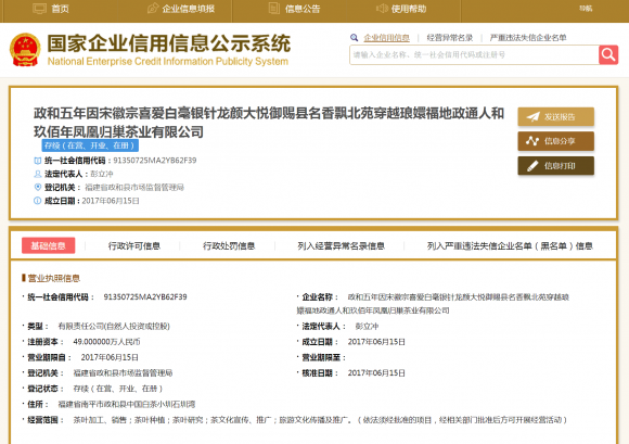 11月27日,“政和五年因宋徽宗喜爱白毫银针龙颜大悦御赐县名香飘北苑穿越琅嬛福地政通人和玖佰年凤凰归巢茶业有限公司”自今年6月15日在福建省政和县注册成功后一直备受全国媒体和广大网友关注,并迅速在网络走红,公司名称竟长达49个字,是中国史上最长名称公司。8月份,国家工商总局发布了《企业名称禁限用规则》,规定企业名称的字号不得使用语句、句群和段落。这意味着再想要注册这么长名字的公司名称已经“此路不通”,也意味着“政和五年因宋徽宗喜爱白毫银针龙颜大悦御赐县名香飘北苑穿越琅嬛福地政通人和玖佰年凤凰归巢茶业有限公司”将成为史上最长的公司名称,后无来者。近日,记者获悉,这家主营政和白茶的公司,已在中国建设银行政和支行成功开户,公司的全套手续都已办理完毕。