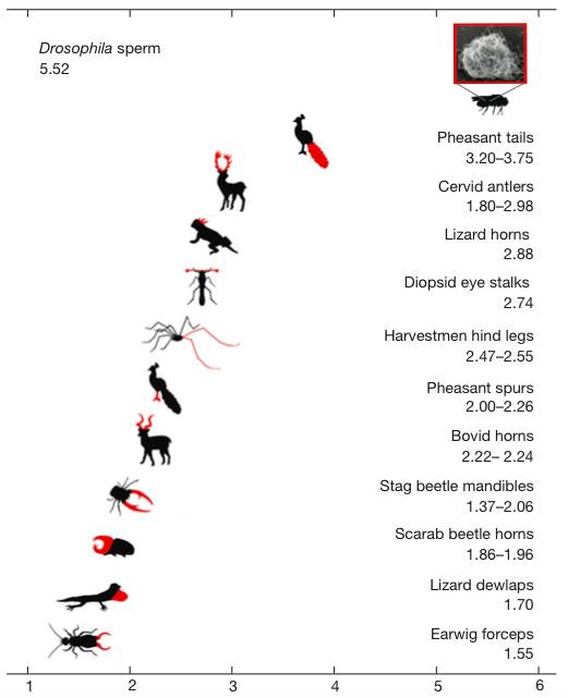 然而,并不是所有物种都是同样的策略,果蝇(Drosophila)就是一个例外。它们的精子非常长,二裂果蝇(D. bifurca)的精子甚至长达5.8厘米,达到它们身体长度的20倍!这可不是什么耍帅无需代价的特征——在果蝇中,精子的长度与雄性产生及被射出精子数量都呈现强烈的负相关,拥有巨大精子的雄性二裂果蝇,生产的精子数量只有雌性生产的卵子数量的区区几倍。理论上说,费力气生产这么长精子将降低雄性果蝇的生殖竞争力才对。这样的“巨大精子悖论”也因此成为一个难以解释的现象。