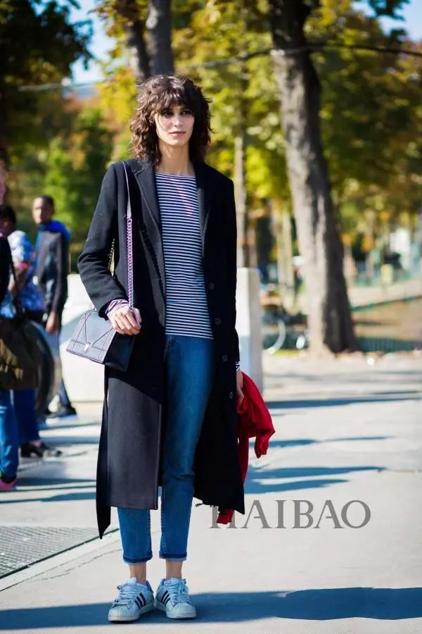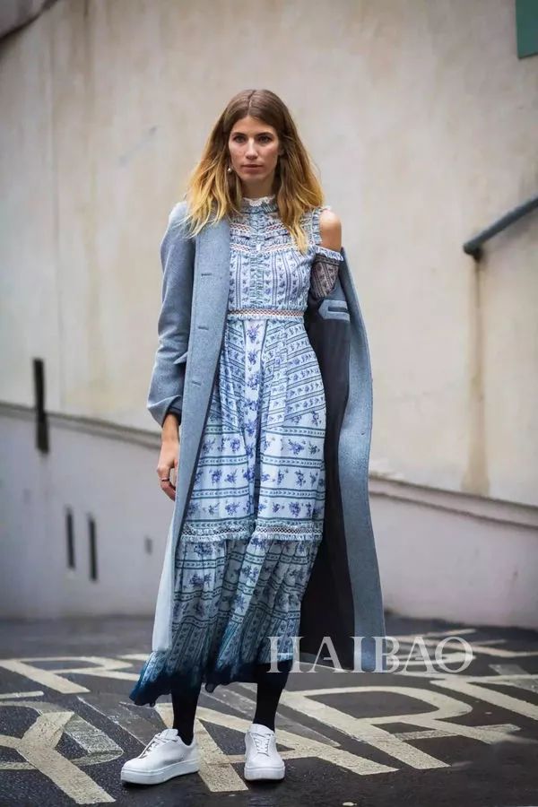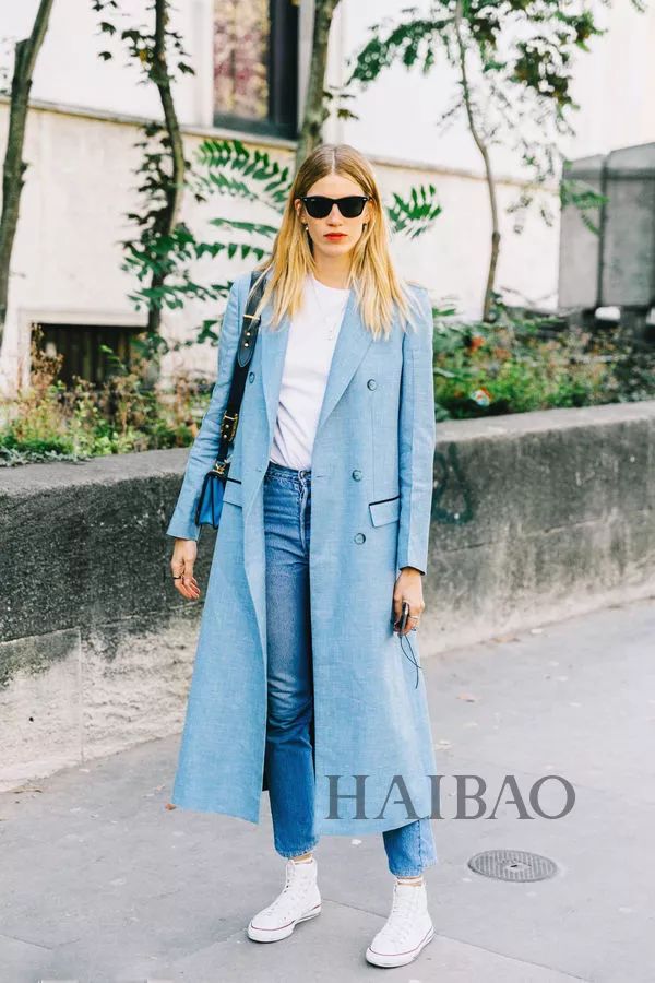 浅蓝色的大衣则更能给人一种温柔的感觉,与白色系的球鞋组合文艺范十足。