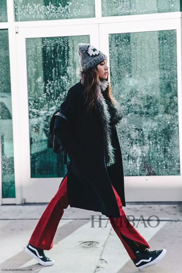 想要时髦点的还可以在裤子上下功夫,红色休闲裤足够吸睛,黑大衣和小白鞋的组合则让整体不失衡。