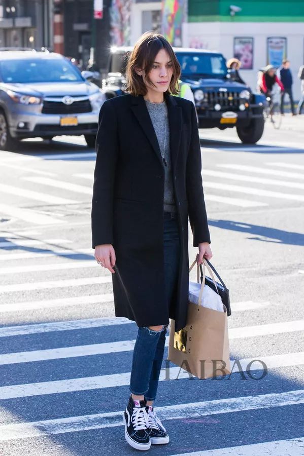 黑色大衣是显气场的一把好手,但搭配不当也会使气质变得沉闷,运动鞋的存在无疑给造型多了几分生机,让整体变得更为生动活泼。