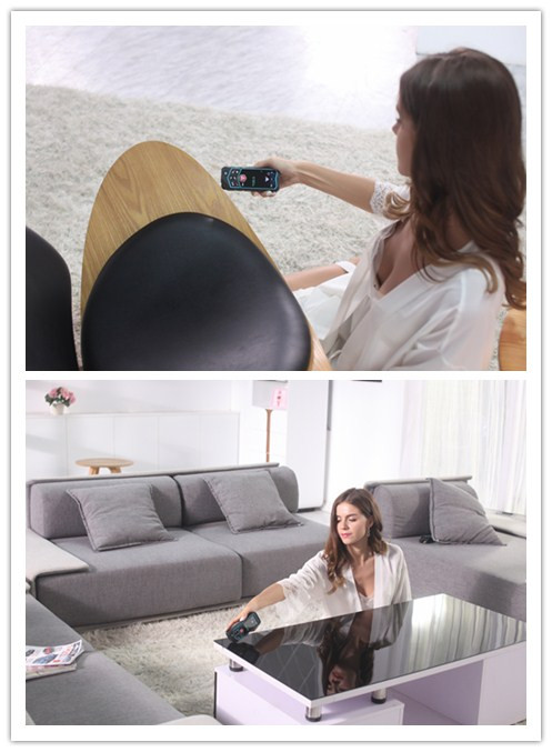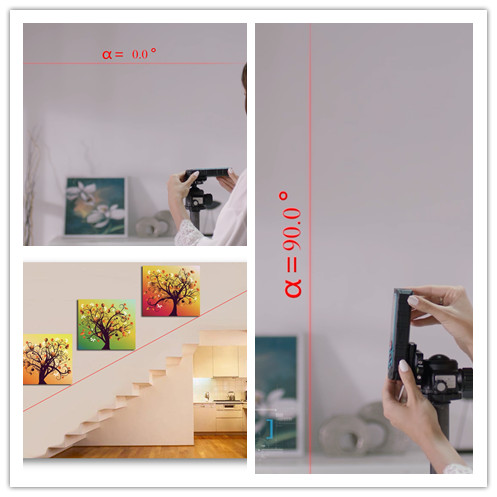 开启一字标线辅助功能,从测距仪一侧打出一条激光线,再通过旋转仪器找准想要的角度,并且角度实时显示在屏幕上,是贴瓷砖,挂画、DIY的好助手。