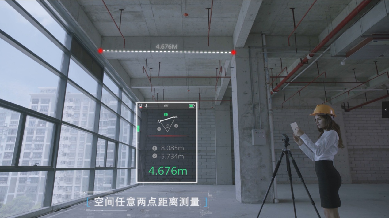 空间任意两点间距离测量功能,只需将激光测距仪分别测量到目标两端的距离,即可得出两点之间的距离,无需登高爬梯,安全又高效。