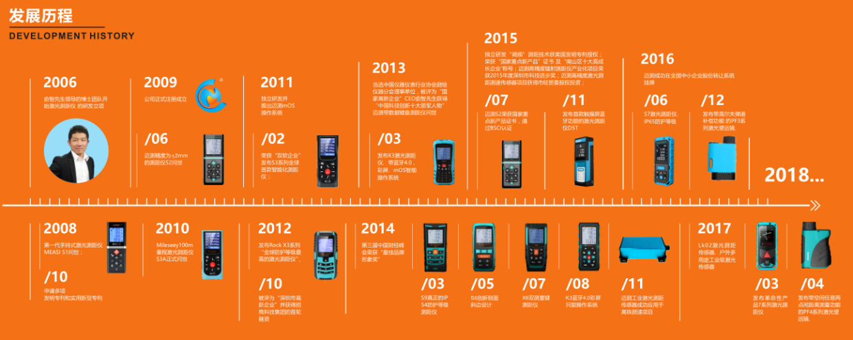 迈测科技于2009年正式成立,是国内较早具有完全自主知识产权的激光测量企业,公司专注于为全球用户提供高品质激光测量产品和专业解决方案,历经发展,迈测科技已经成为集研发、制造、销售为一体的高科技企业。迈测科技每年推陈出新,每一款推出的新品都能引起行业内的关注。