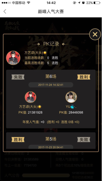 作为“巅峰之战”的第三站,巅峰人气大赛是主播受邀参加花椒1218直播节的最后机会,目前已进入到全国总决赛阶段。比赛中,主播们可以通过PK赛来获取人气值加分,主播在活动页面点击“开始PK”后,系统会随机匹配主播进行共计5分钟的PK,获胜者便可获得2分年度人气值。