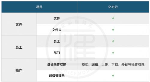 亿方云提供了完善的权限管理功能。企业可以根据文件或文件夹分配权限,也可以根据员工或部门分配权限,权限种类除基础的操作权限外,还可以转让超级管理员权限。