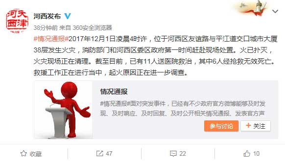 天津某大厦起火已致6人死亡 11人送医救治