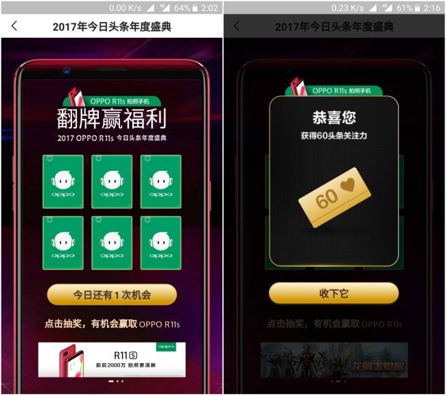 参与用户还可参与翻牌抽奖,有机会赢取盛典门票、OPPO R11s手机、OPPO自拍杆、iPad、Beats耳机、YSL/Chanel等品牌口红和头条关注力等大奖!