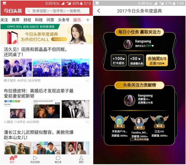 首先登陆今日头条,进入娱乐频道“2017今日头条年度盛典专题”,完成每天任务,获取头条关注力。例如“签到打卡”任务,即可获得100头条关注力,完成 “阅读微头条”任务,即可获得50头条关注力。粉丝可以将关注力送给自己喜欢的明星。刷刷头条,轻轻松松推爱豆上头条!