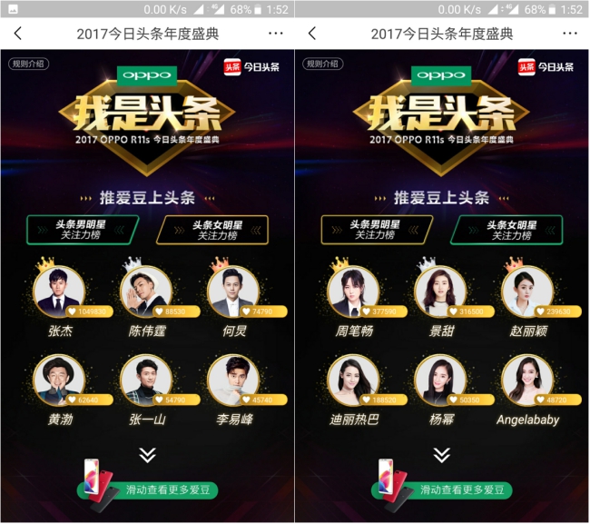 12月2日,今日头条正式宣布“我是头条·2017今日头条年度盛典”将于12月17日在北京举办,同时在今日头条App开启“推爱豆上头条”年度人气明星评选活动。由头条用户选出年度男、女人气明星,赵丽颖、李易峰、Angelababy、杨洋等40位当红人气偶像参与角逐。