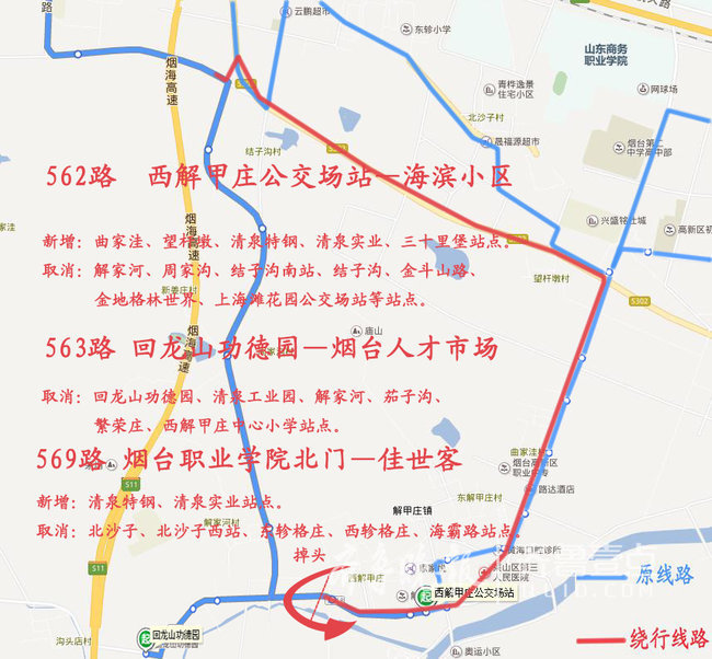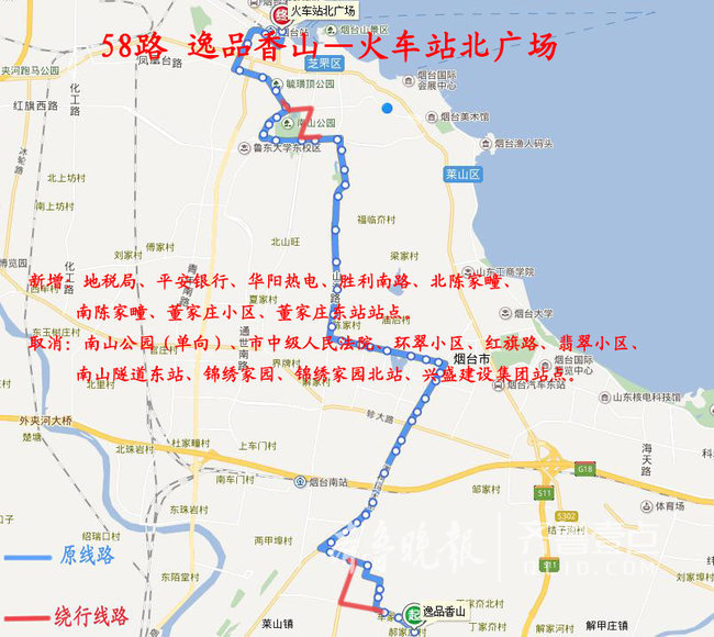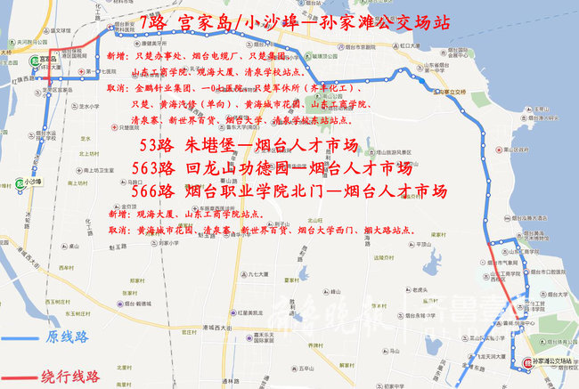 取消: 黄海汽修(单向)、黄海城市花园、山东工商学院、清泉寨、新世界百货、烟台大学、清泉学校东站站点。