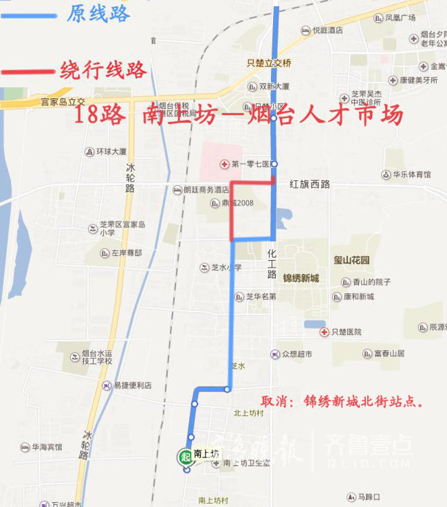 原线路:(南上坊—烟台人才市场)由原线路运行至楚玉路与芝纬北三街交叉路口右转,沿芝纬北三街运行至芝纬北三街与化工路交叉路口左转恢复原线路。
