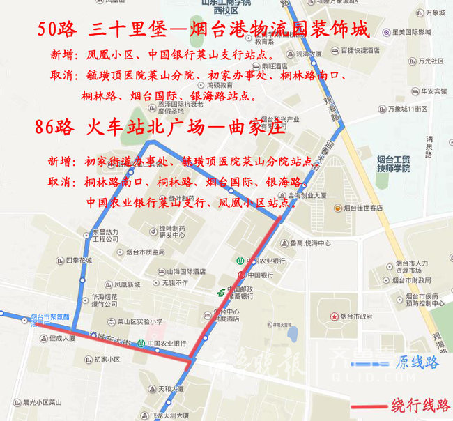 取消:桐林路南口、桐林路、烟台国际、银海路、中国农业银行莱山支行、凤凰小区站点。
