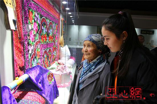 亲戚们参观博物馆民族手工刺绣展品