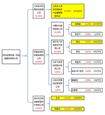 通过对公司实际控制人的进一步分析,得到上图,出资额占比排首位的为大同市人民政府国有资产监督管理委员会,出资占比41.00%;排第二位的是中腾时代集团有限公司的陈雪峰,出资占比16.49%;其次为深圳市乐投金融信息技术有限公司的两位股东王龙和陈奇兵,出资占比各为10.00%,其中王龙作为深圳前海极速一百金融服务有限公司的法人代表兼执行董事和总经理,其出资占比较多一定程度彰显了公司运营发展的可持续性;排第五位的是武汉市川归信息技术有限公司的周治,出资占比9.95%。前五大出资人合计出资占比达87.44%,其他出资人占比则相对较少。