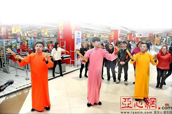 11月12日,新疆相声巴扎曲艺宣讲团的成员们在乌鲁木齐市劳动街家乐福超市以相声快板“快闪”的形式宣传党的十九大精神。莫兴伟供图