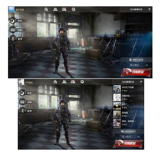 在吃鸡游戏准备界面也可以注意到,华为麦芒6极光蓝全面屏中显示的武器库背景,要比iphone 8 plus普通屏显示的更多,包括左侧的窗户,以及右侧的枪械,可见麦芒6极光蓝全面屏显示画面的扩展并不是暴力拉伸,而在真正的游戏适配。