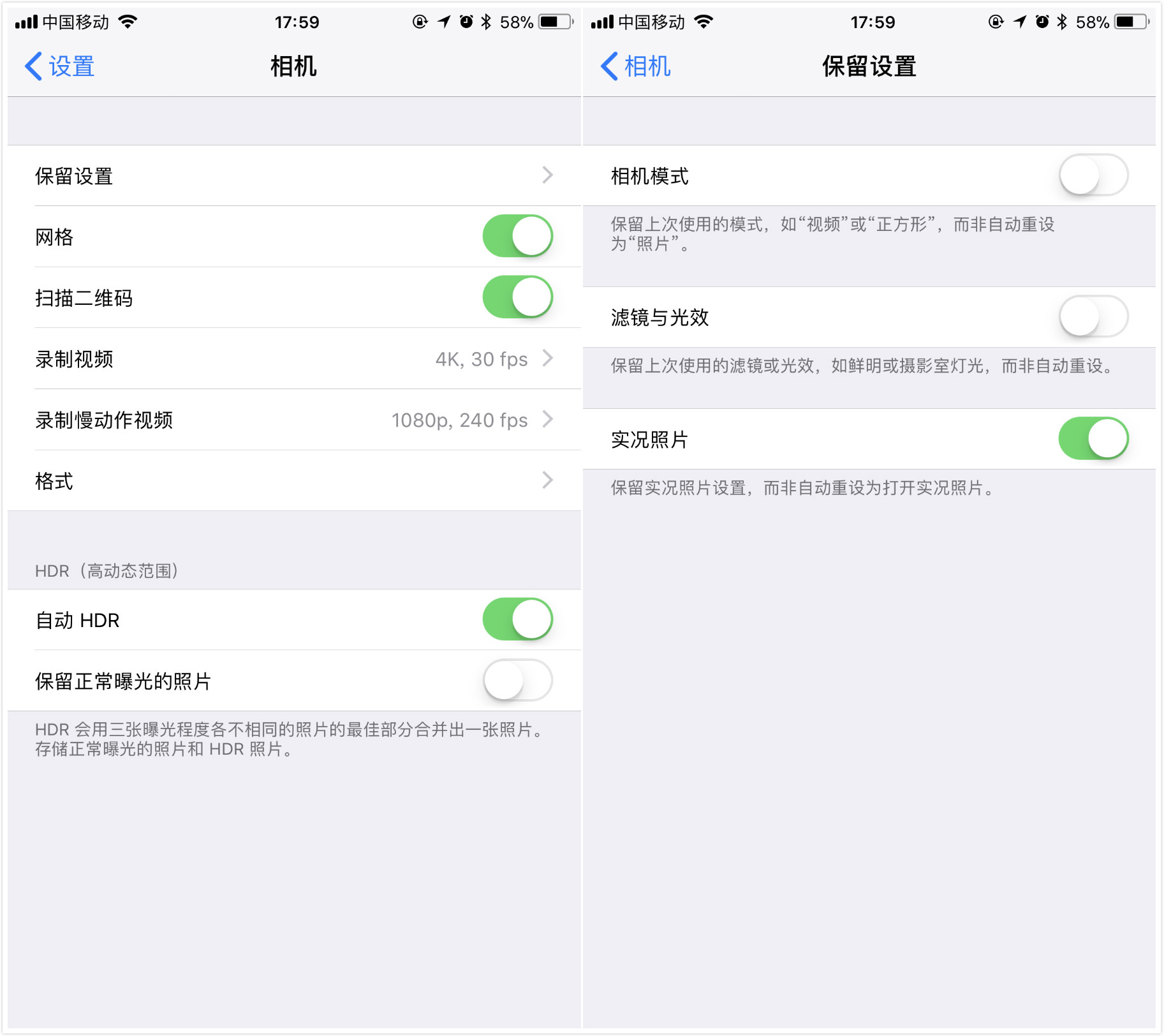 Live Photo 演示可iOS 11 至今仍存在这样一个诡异的Bug:相机App 偶尔会出现恢复默认设置的情况,此时会自动开启Live Photo,这也导致很多用户在不知情的情况下,录下了很多短视频…… 遇到这种情况,可以先在「设置」中选择「相机」,之后点击「保留设置」,打开「实况照片」功能——如果还会遇到Live Photo 自动打开的问题,那也就只好等待苹果修复这个糟心的Bug 了。