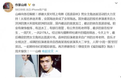 据今天作家山峰新浪微博:“山峰向各位鞠躬!感谢大家对纸上电影《荔波森林》男女主角选拔活动的大力支持!从报名参选来看,全国海选变成了全球海选。国外最远的报名参演者来自大洋洲的澳大利亚和欧洲的法国,国内最远的是黑龙江,最近的就在荔波县城。职业有健身教练,有送水工,有银行高管,有公务员和老师等,最多的是在校学生,一周7天,一共2178人。经过我与摄影师杜建升的精挑细选,今天上午,最后确定的男女主角抵达荔波片场。森林的扮演者是来自广州的古琴老师、音乐才女杨沇芝,成镇的扮演者是来自西南某高校表演系大二学生、人称“小周一围”的甘贤吕。一起期待他们的精彩表现。再次感谢各位!继续支持《福到福泉》海选!周末愉快!一一山峰”