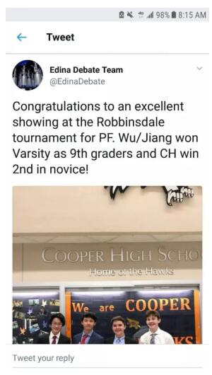 Evan和Isaac均来自美国明尼苏达州,现读于Edina High School,他们的高中学校为了庆祝和分享他们辩论赛第一名的好消息,还特意发布在了官方Tweet上。(翻译:祝贺PF在robbinsdale联赛的优异表现。Wu/Jiang作为9年级学生 赢得高中代表队,CH获得新选手第二名!)